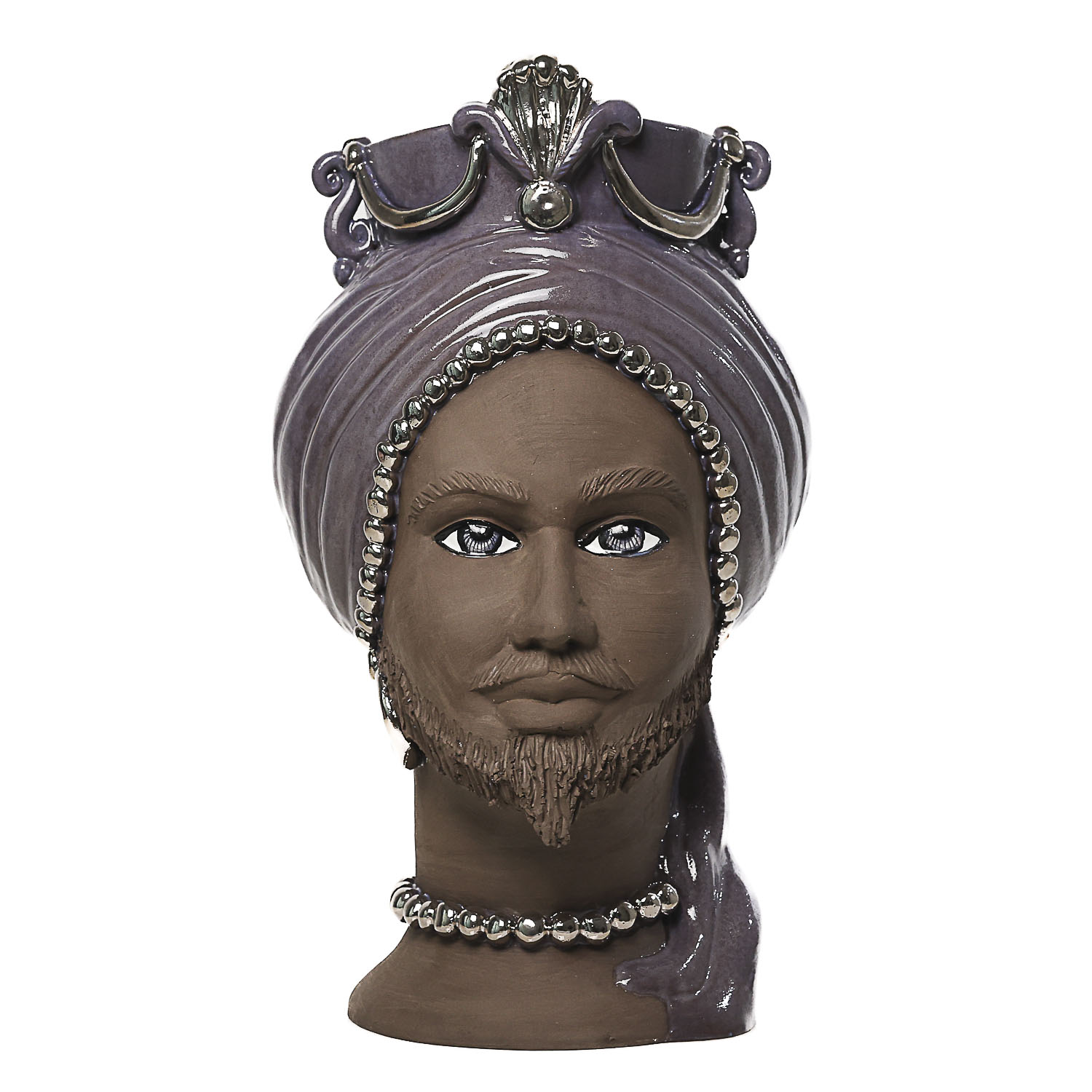 Immerse yourself in elegance and history with our Acamante Moor’s Head: an authentic work of art handcrafted by our master artisans in Caltagirone. This particular black clay head stands 43 cm tall, with its amethyst-coloured turban and platinum details, adds a touch of luxury and prestige to any setting.