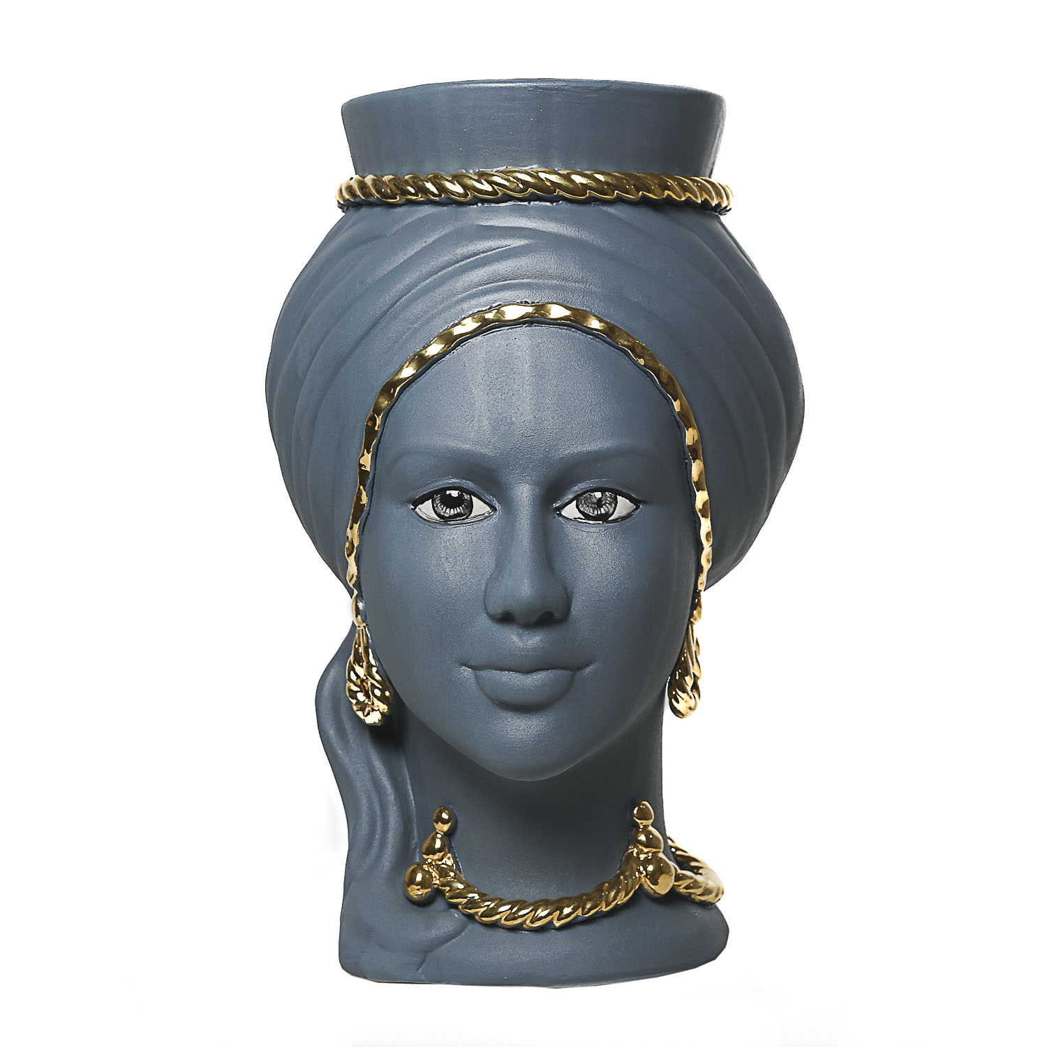 Immerse yourself in elegance and history with our Selene Moor’s Head: an authentic work of art handcrafted by our master artisans in Caltagirone. This particular white clay head, 43 cm tall, thanks to its textural avion color and gold details, adds a touch of luxury and prestige to any setting.