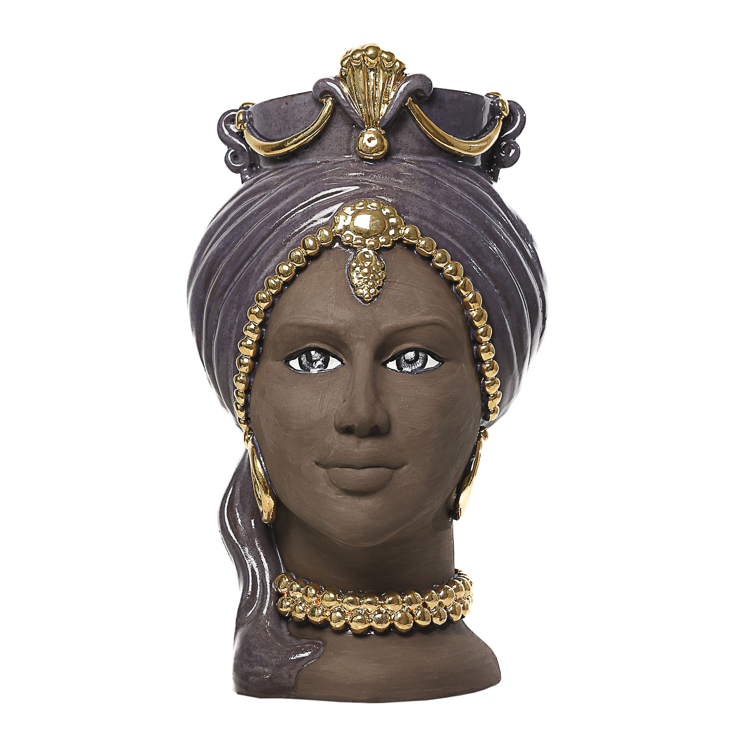 Immerse yourself in elegance and history with our Phyllis Moor’s Head: an authentic work of art handcrafted by our master artisans in Caltagirone. This particular black clay head stands 43 cm tall, with its amethyst-coloured turban and platinum details, adds a touch of luxury and prestige to any setting.