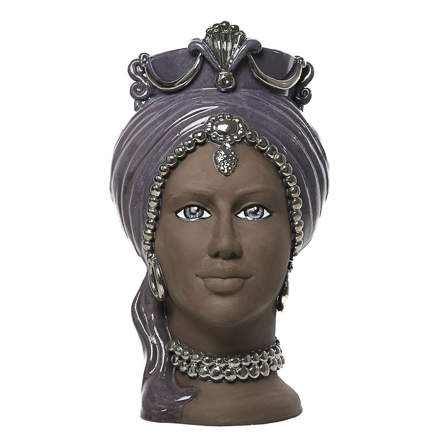 Immerse yourself in elegance and history with our Phyllis Moor’s Head: an authentic work of art handcrafted by our master artisans in Caltagirone. This distinctive black clay head stands 43cm tall, with its amethyst-coloured turban and platinum detailing, it adds a touch of luxury and prestige to any setting.