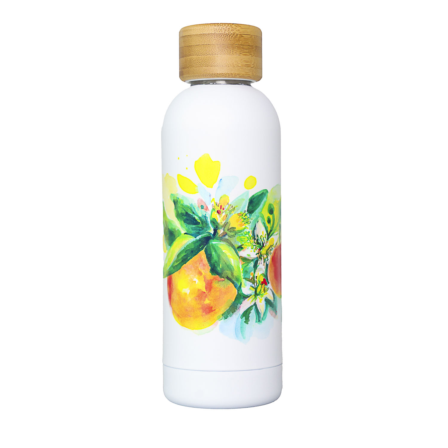 Thermal bottle depicting Oranges in Bloom, a citrus fruit symbol of Sicily.