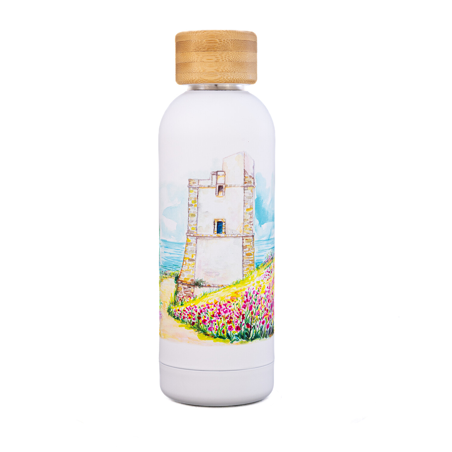 Thermal bottle depicting Saracen tower, a distinctive symbol of the landscapes of western Sicily.